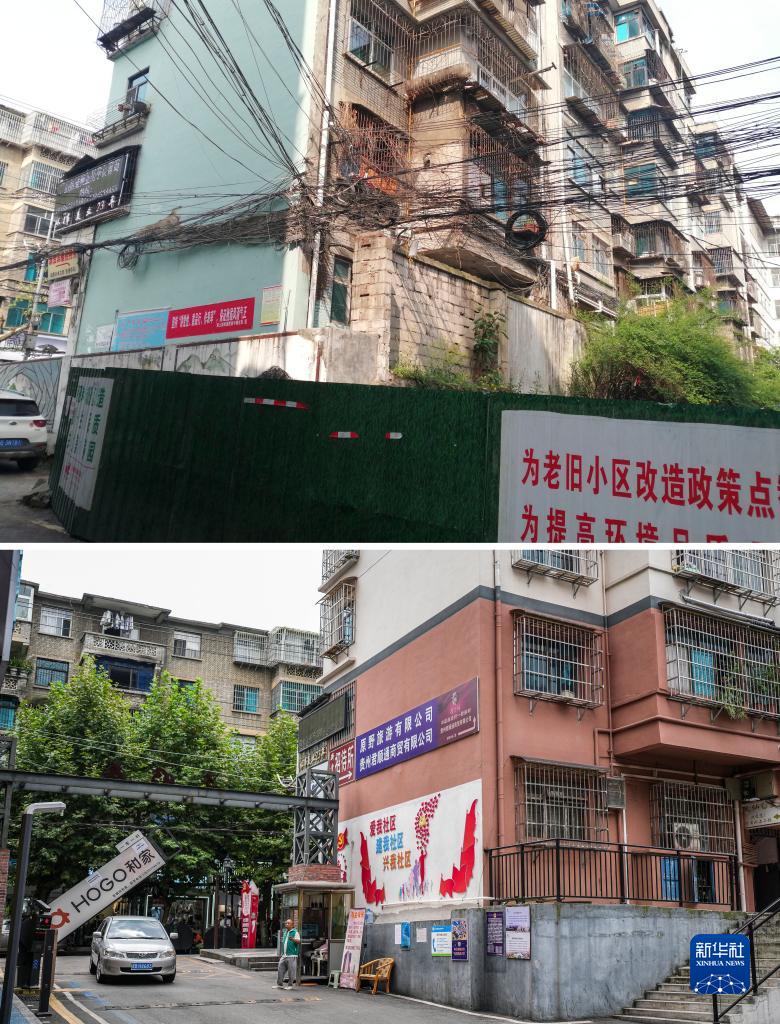 拼版照片:上图为改造前的六盘水市钟山区黄土坡街道文明巷小区(资料照片);下图为改造后的文明巷小区(8月17日新华社记者陶亮摄)。