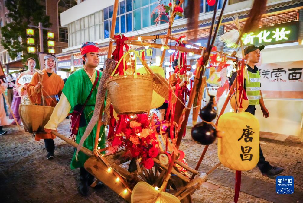 8月18日拍摄的在“唐昌之夜”主题文化节上展示的当地民俗踩街表演。