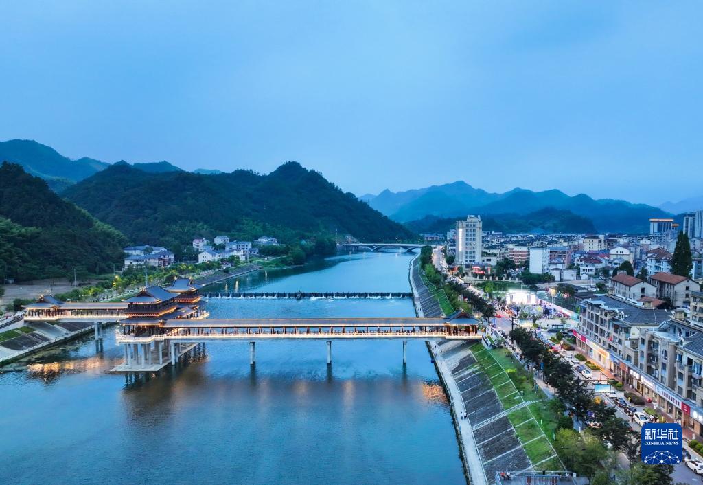 8月18日无人机航拍的昌化镇昌化溪夜景(无人机照片)。
