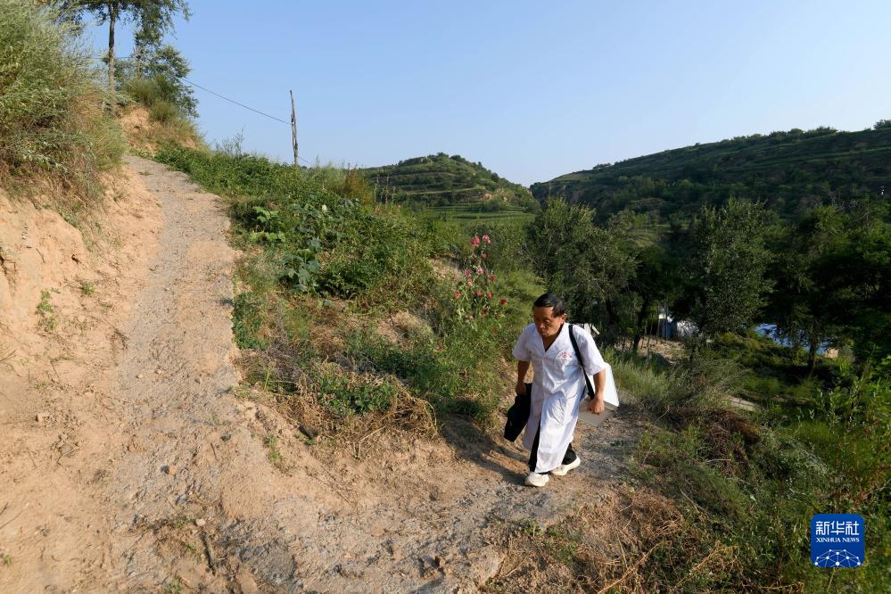 在石楼县龙交乡王家沟村,杨兴荣背着药箱走在出诊的山路上(8月14日摄)。