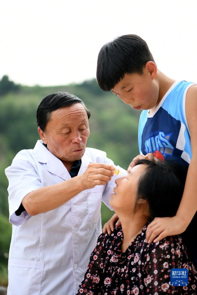 在石楼县龙交乡王家沟村苍墕自然村,村医杨兴荣为村民滴眼药水(8月15日摄)。