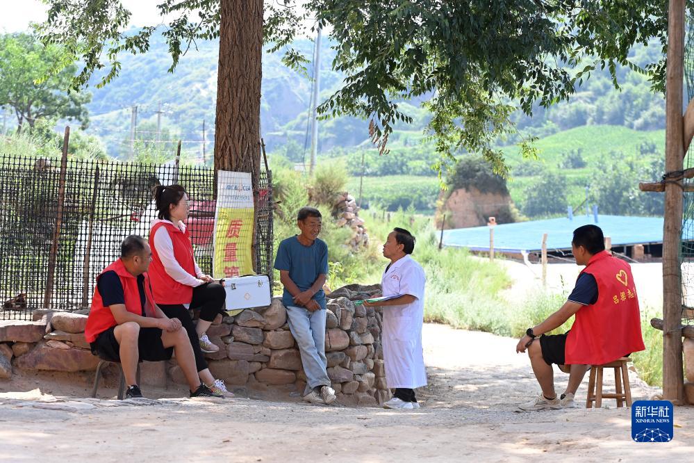 在石楼县龙交乡王家沟村,村医杨兴荣(右二)和驻村帮扶工作队一起入户走访(8月16日摄)。