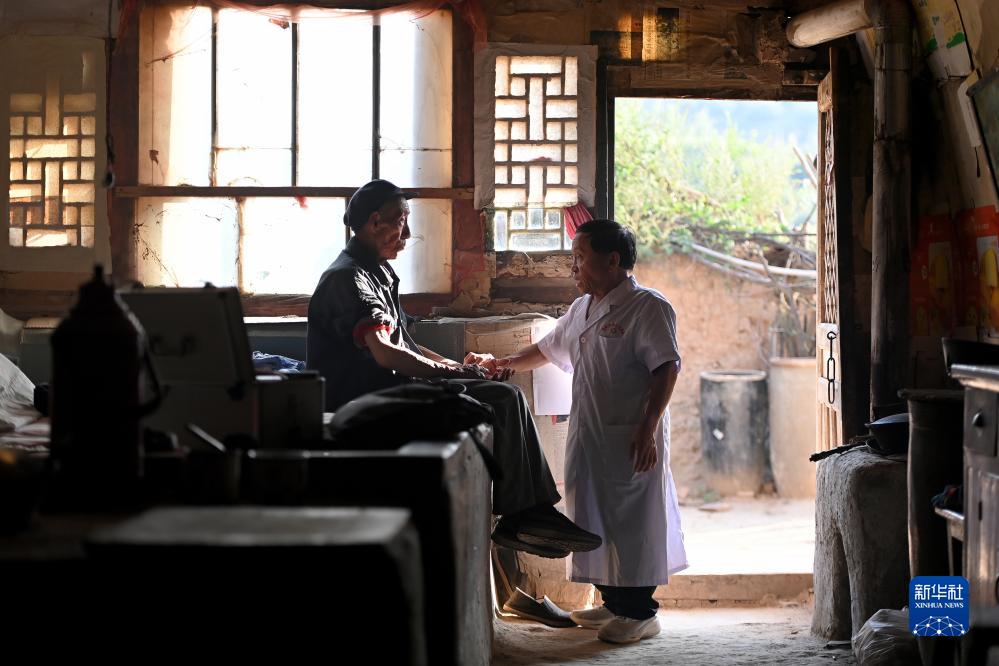 在石楼县龙交乡王家沟村,杨兴荣(右)在为村民检查身体(8月14日摄)。