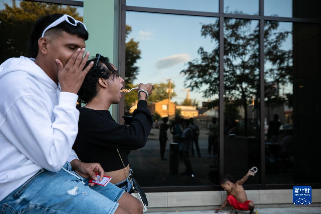 8月17日,移民在美国伊利诺伊州芝加哥第9区警察局外吃饭。