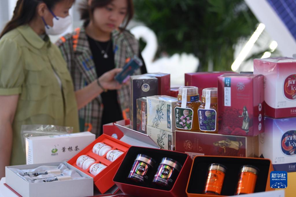 8月18日,在2023(中国)亚欧商品贸易博览会上,市民在挑选产自新疆尉犁县的罗布麻系列产品。