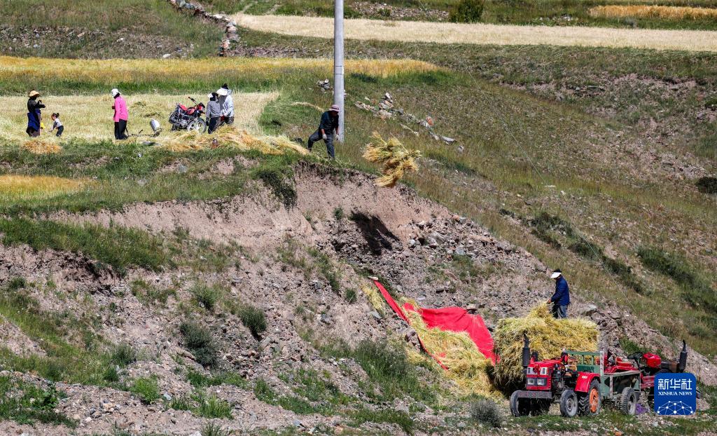 目前,西藏各地进入秋收时节。西藏昌都市边坝县的农民抓紧收割青稞和牧草,确保颗粒归仓。