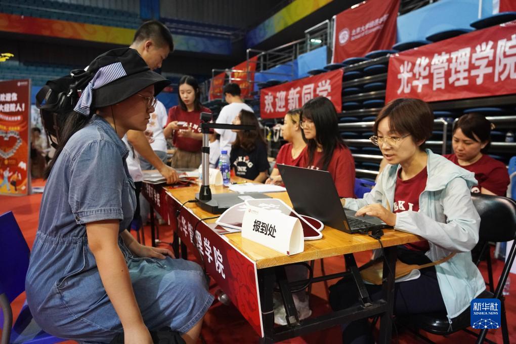 8月19日,在北京大学邱德拔体育馆,一名光华管理学院的2023级本科新生(左一)报到。