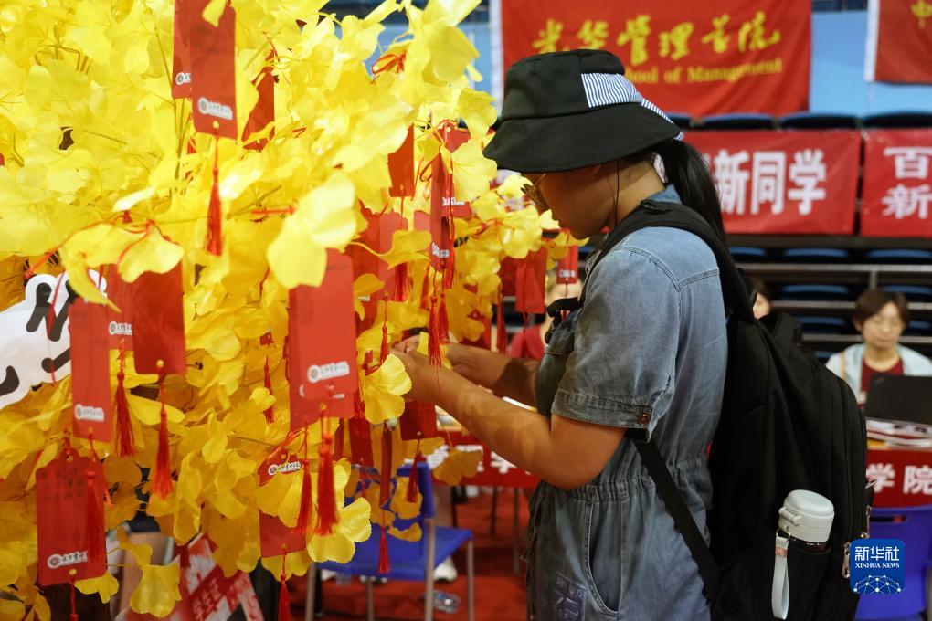 8月19日,在北京大学邱德拔体育馆,一名光华管理学院的2023级本科新生将祝福语挂在“签到树”上。