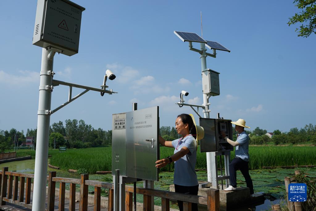 8月18日,在位于安徽省六安市裕安区的清凉寺分渠灌区林水寨生态园,工作人员操作水闸控制稻田水位。
