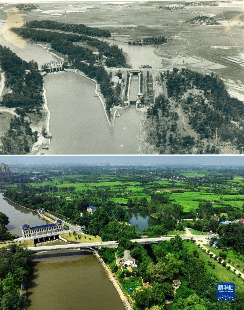 这是一张拼版照片。上图为:1976年拍摄的位于安徽省六安市金安区的淠河总干渠罗管节制闸(新华社发 田准摄);下图为:2023年8月18日拍摄的淠河总干渠罗管节制闸(无人机照片,新华社记者杜宇摄)。