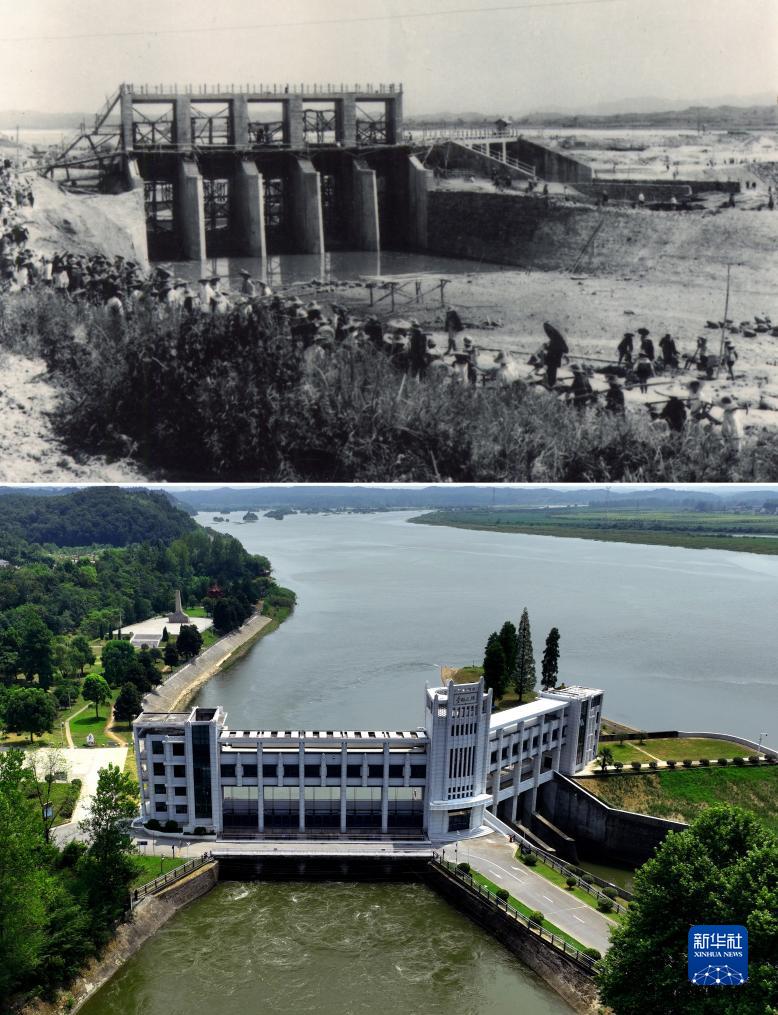 这是一张拼版照片。上图为:1959年拍摄的位于安徽省六安市裕安区的淠河总干渠渠首横排头水利枢纽(新华社发 田准摄);下图为:2023年8月18日拍摄的淠河总干渠渠首横排头水利枢纽(无人机照片,新华社记者杜宇摄)。