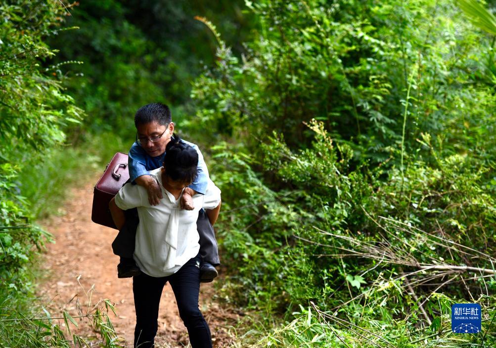 8月15日,黄淑珍背着丈夫走在出诊路上。由于出诊的部分道路无法通车,黄淑珍只得背着丈夫缓缓前行。