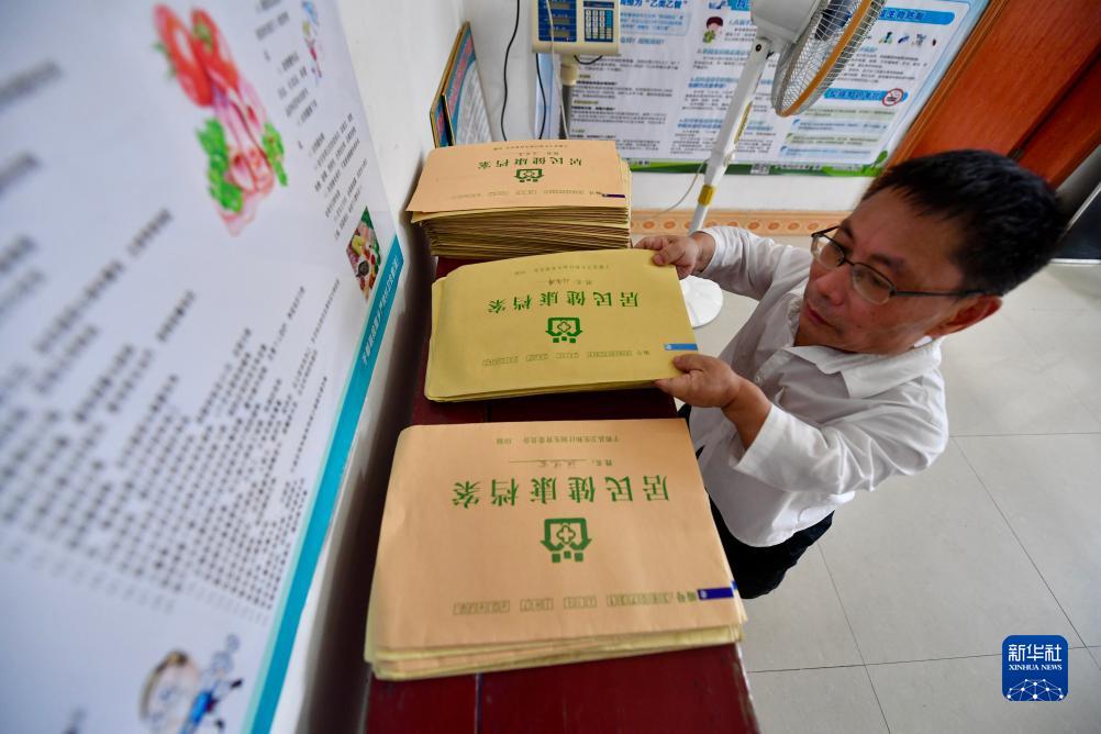 8月16日,肖九林在诊所内整理村民的健康档案。