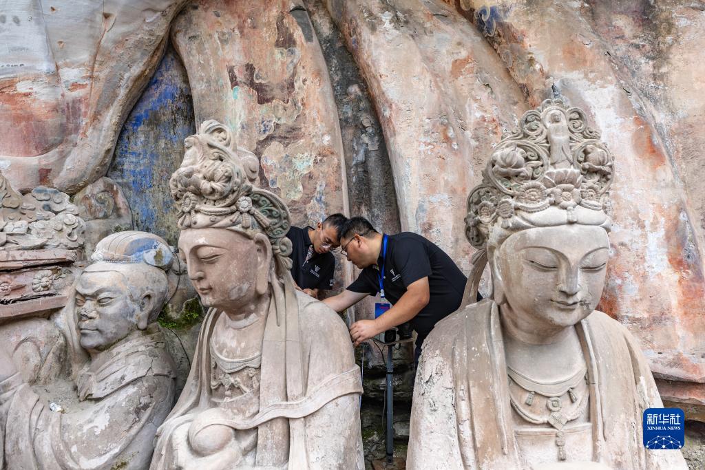 8月19日,在大足石刻宝顶山景区,工作人员对石刻造像病害进行处理。