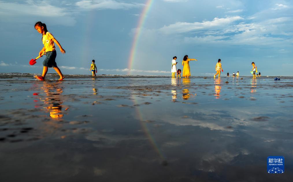 8月14日,一场晨雨过后,日出时分,在广西东兴的金滩,“国道之行 从雪山奔向大海”报道组偶遇了朝阳与彩虹“共舞”的奇妙景观。