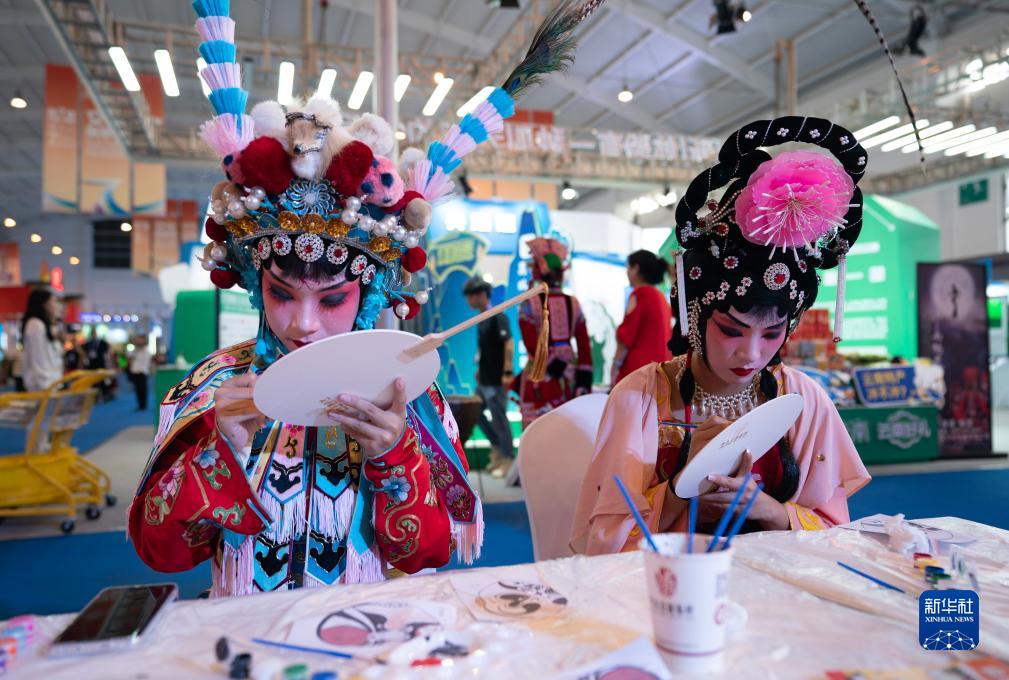 8月16日,在南博会文化旅游馆滇剧展演区,两名来自云南省滇剧院的演员在扇子上绘制脸谱。