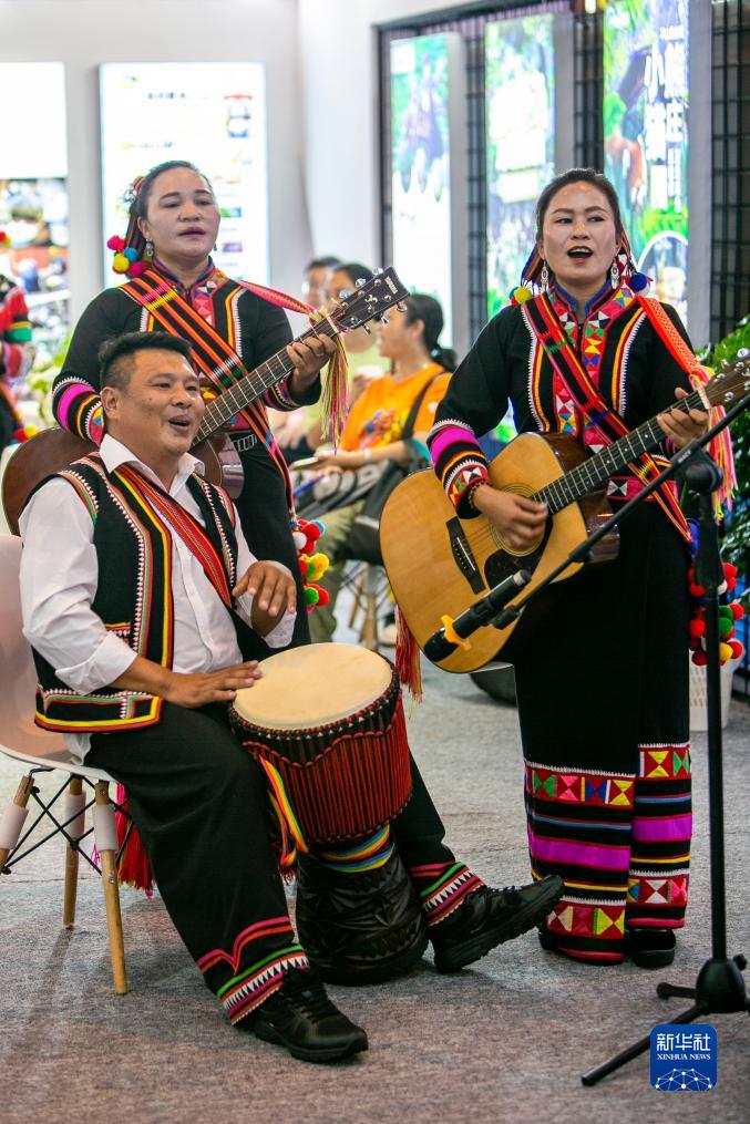 8月18日,演员在文化旅游馆内的普洱展区表演传统歌曲。