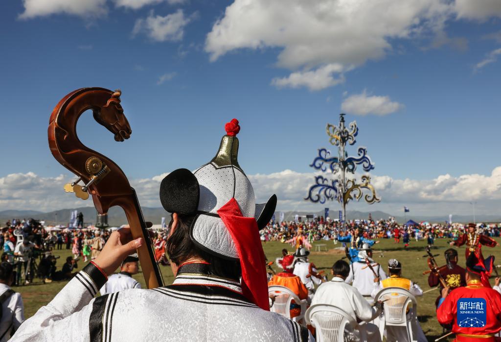 8月18日,在蒙古国泰吉山谷,文化节开幕式上演员在演奏马头琴。