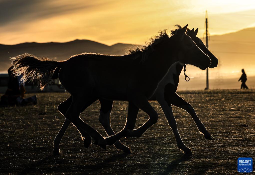 这是8月19日在蒙古国泰吉山谷拍摄的两匹在暮色中奔跑的小马驹。