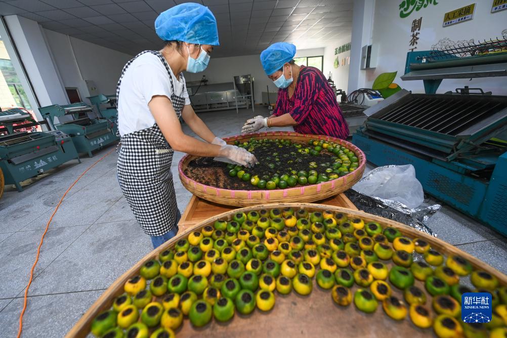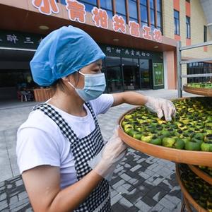 8月20日,在浙江省建德市三都镇松口村的小青柑共富工坊,工人忙着填充茶叶,将新鲜的小青柑加工制成青柑茶。