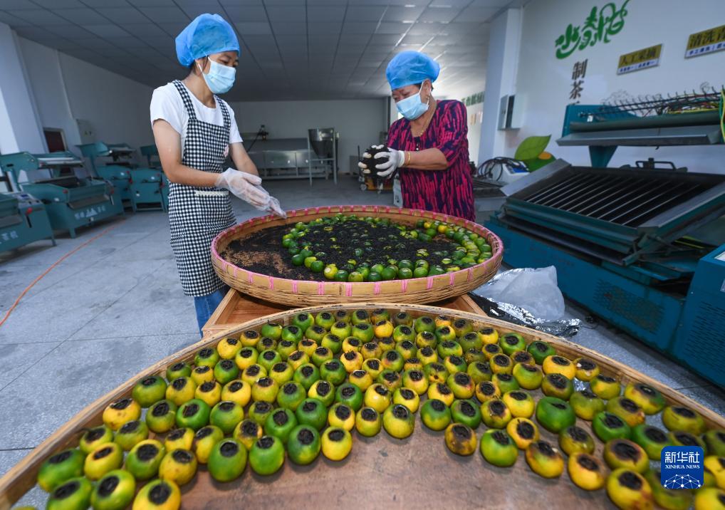 8月20日,在浙江省建德市三都镇松口村的小青柑共富工坊,工人忙着填充茶叶,将新鲜的小青柑加工制成青柑茶。