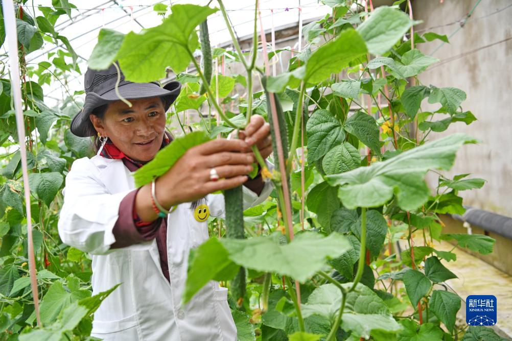 措勤县高原生态畜牧业现代化养殖一体化产业综合基地合作社社员白玛在蔬菜大棚采摘黄瓜(8月19日摄)。