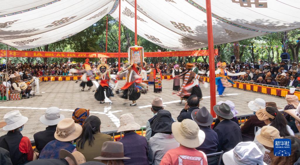 8月19日,在拉萨市罗布林卡园林内,贡嘎县乃萨藏戏队在为观众表演藏戏《朗萨雯崩》。