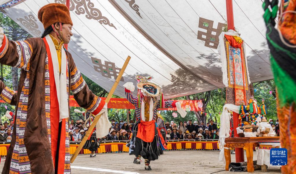 8月19日,在拉萨市罗布林卡园林内,贡嘎县乃萨藏戏队在表演藏戏《朗萨雯崩》。
