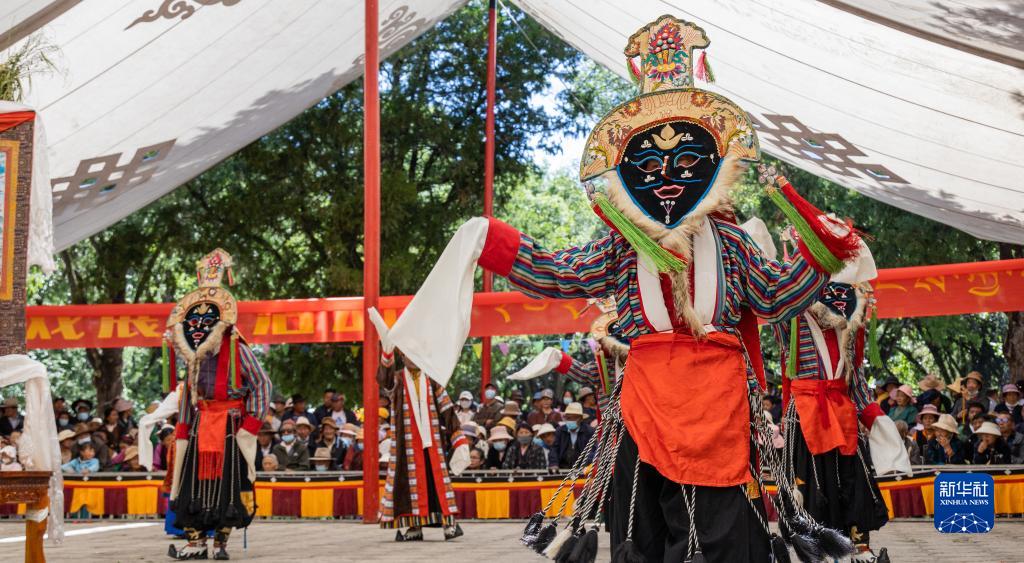 8月19日,在拉萨市罗布林卡园林内,贡嘎县乃萨藏戏队在表演藏戏《朗萨雯崩》。