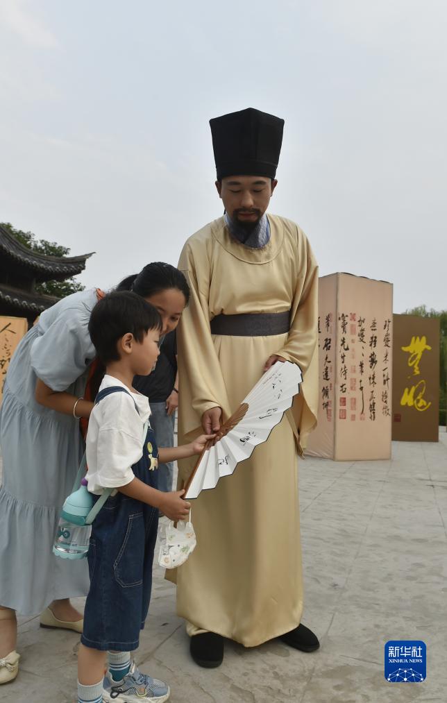 8月19日,身穿古装的工作人员在中国翰园碑林景区与游人互动。
