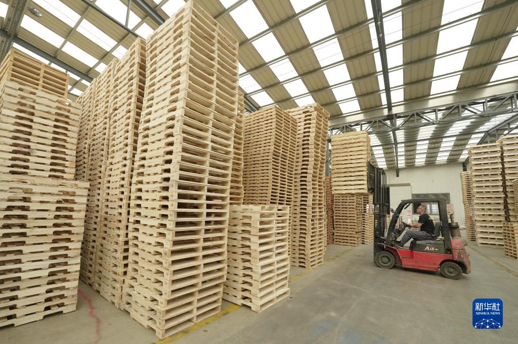 8月20日,工人在唐山市丰南区小集镇钱庄村一家木质包装产品企业的成品库操作叉车码放产品。