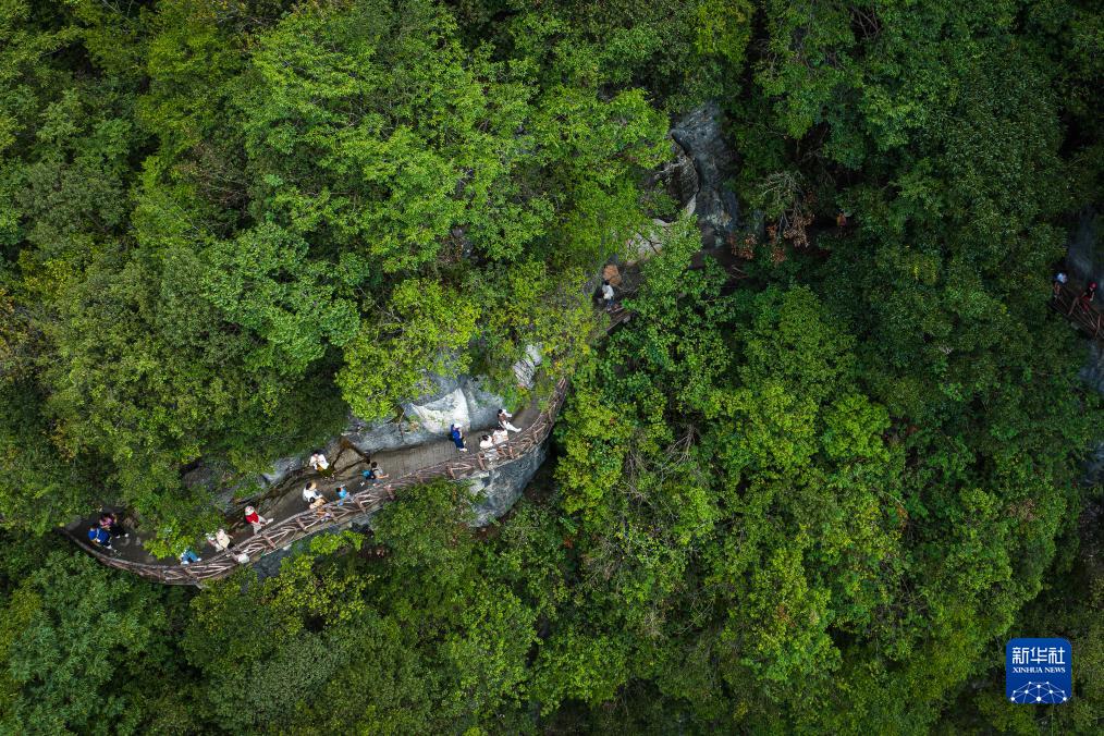 8月20日,游客在湖北省恩施州建始县地心谷景区游玩(无人机照片)。