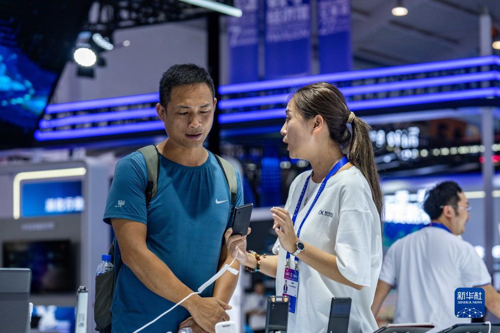 8月16日,客商(左)在第七届中国—南亚博览会科大讯飞展区了解翻译设备。
