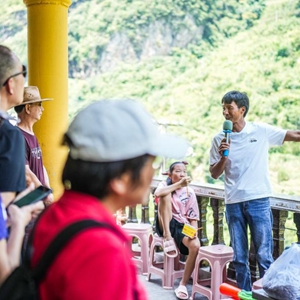 马选军向从广东来的游客介绍北盘江大桥和家乡的变化(8月16日摄)。