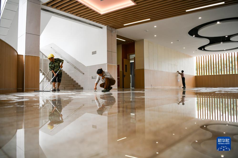 8月20日,在四川省宜宾市第三中学三江校区(高中部),工人在进行保洁工作。