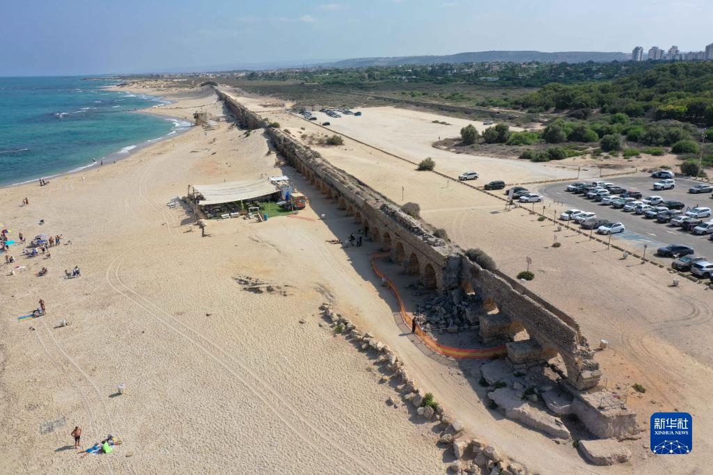这是8月20日在以色列城市凯撒里亚拍摄的古罗马渡槽坍塌现场(无人机照片)。