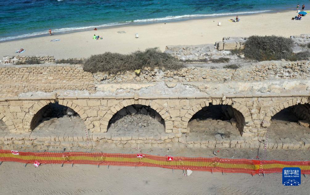 这是8月20日在以色列城市凯撒里亚拍摄的古罗马渡槽遗址(无人机照片)。
