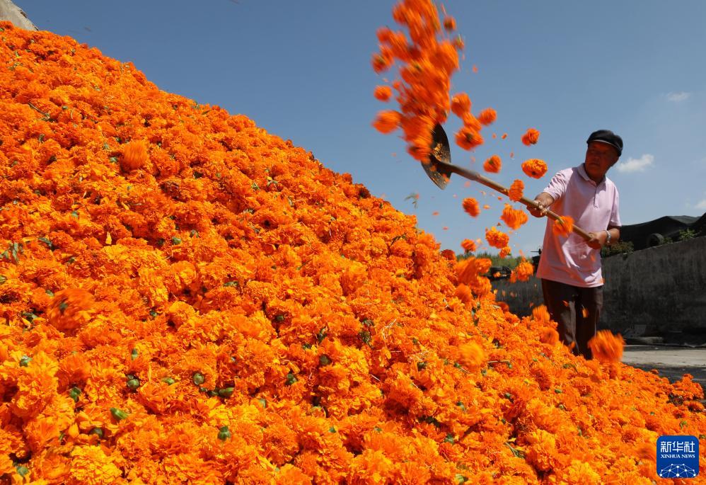 8月20日,在河北省平泉市平北镇的万寿菊花朵收储基地,农民将刚刚采收的万寿菊花朵进行集中收储。