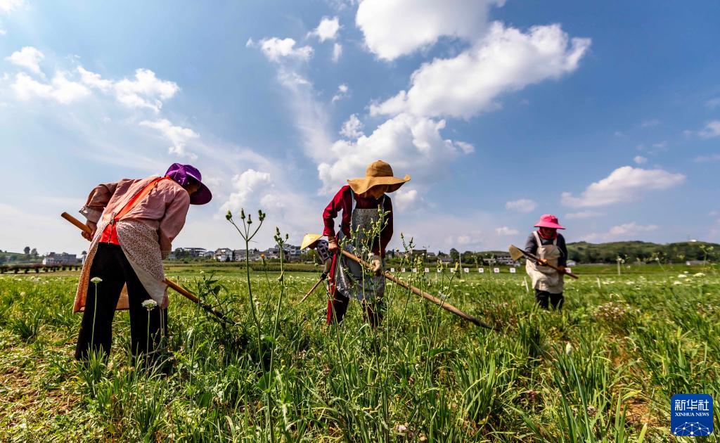 村民在贵州省黔西市林泉镇海子村韭菜种植示范基地锄草(8月20日摄)。