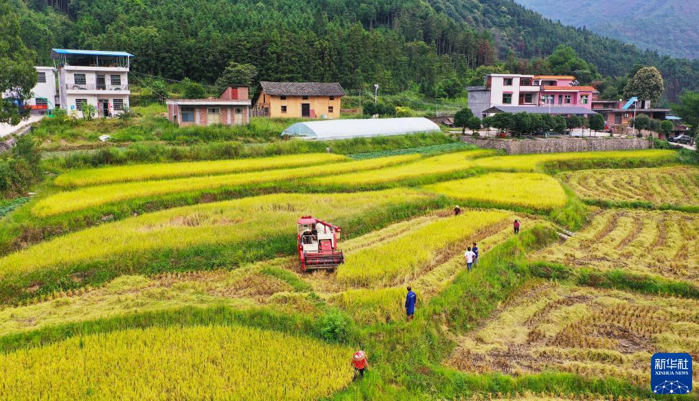 8月20日,湖南省永州市新田县金陵镇下兰冲村,村民驾驶农机收割水稻(无人机照片)。