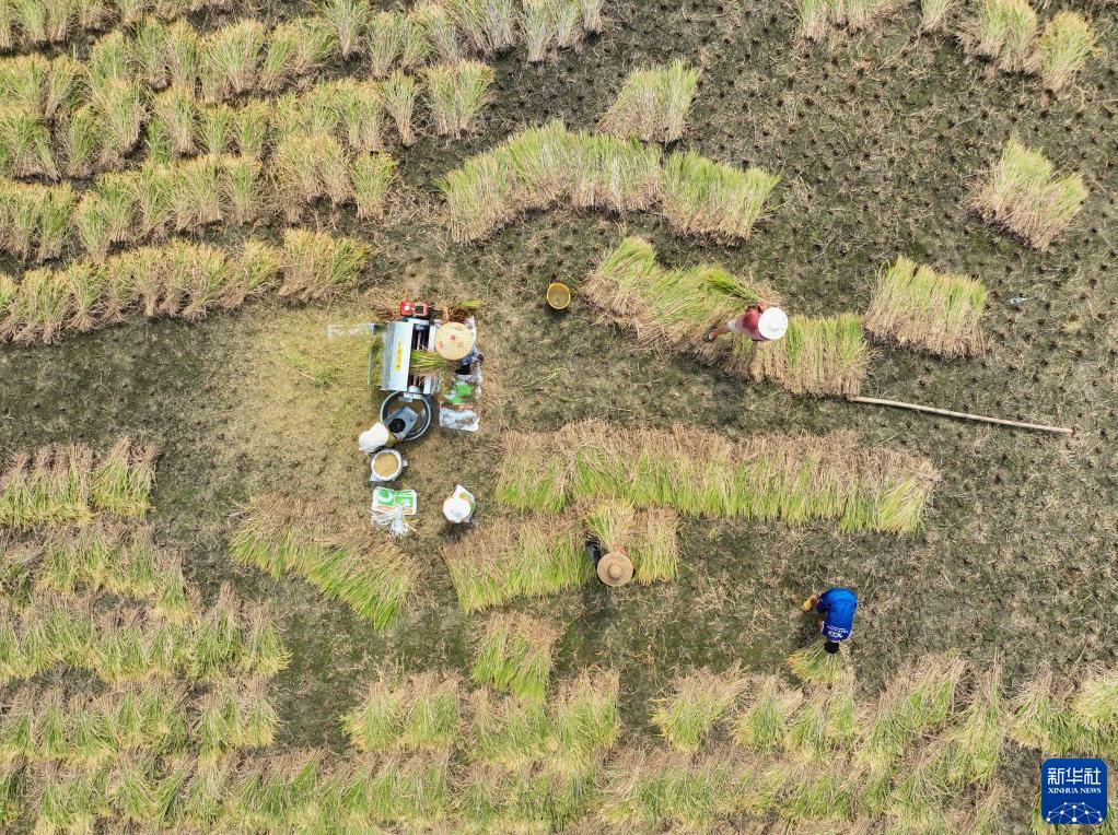 8月20日,在湖南省永州市道县清塘镇廖家村,农民在收获水稻(无人机照片)。