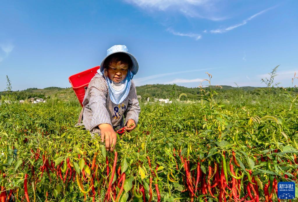 村民在贵州省黔西市林泉镇营脚村采摘辣椒(8月20日摄)。