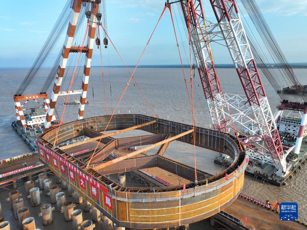 8月20日,由中铁大桥局施工的崇启公铁长江大桥4号主墩首节钢围堰安装到位,标志着崇启公铁长江大桥4号主墩正式转入大体积承台施工阶段。