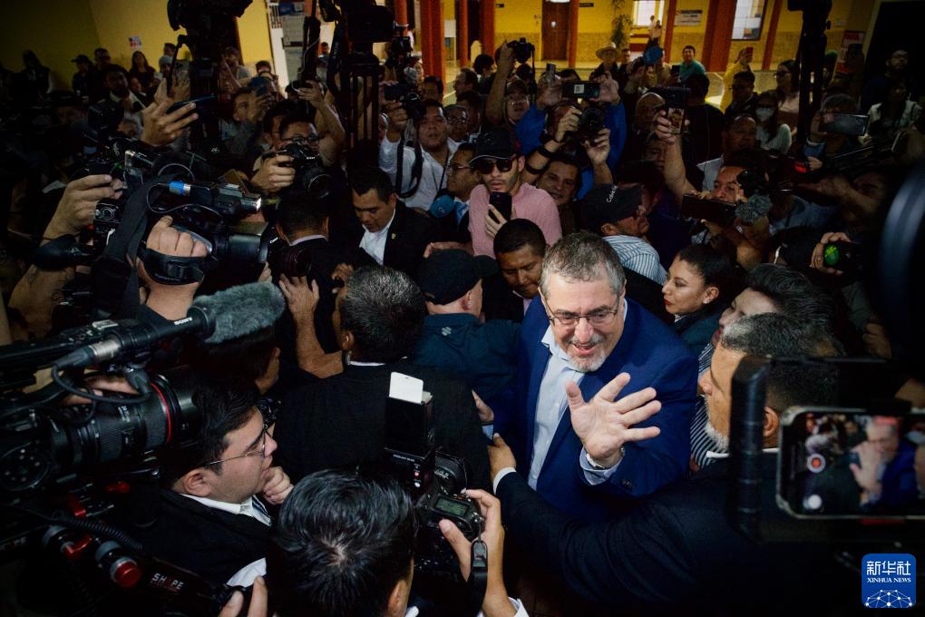 8月20日,在危地马拉首都危地马拉城一处投票站,危“种子运动”党候选人贝尔纳多·阿雷瓦洛在投票后挥手示意。