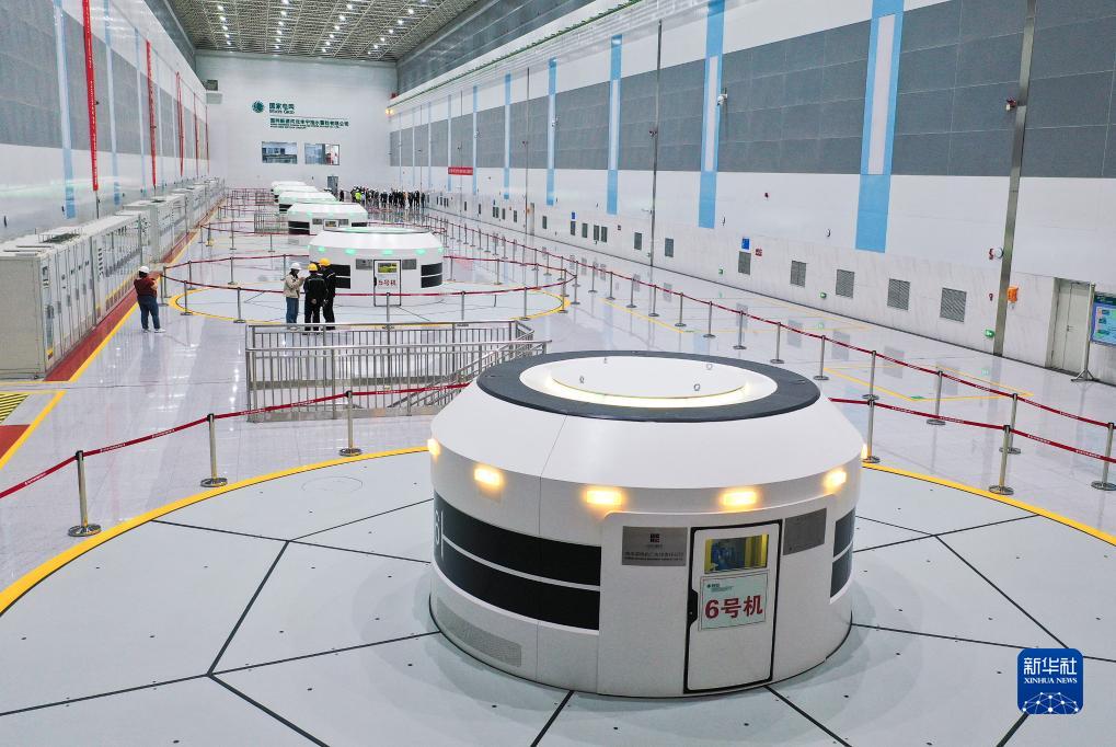 位于河北承德的国网新源丰宁抽水蓄能电站地下厂房内的可逆式水泵水轮发电机组单机容量30万千瓦(8月19日摄,无人机照片)。12台机组全部安装完成后将是我国自主设计建设、世界装机容量最大的抽水蓄能电站。