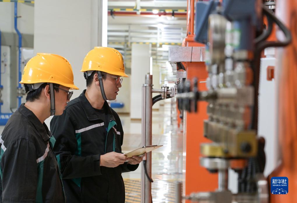 在河北承德的国网新源丰宁抽水蓄能电站地下厂房内,工作人员对设备进行巡检(8月19日摄) 。