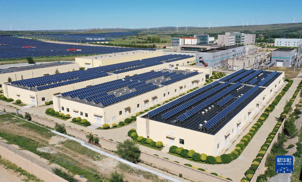 在河北张家口的国家风光储输示范工程内数排储能厂房并列其中,这是风光储输系统中重要的电力存储设备(8月18日摄,无人机照片)。