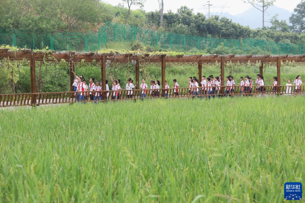 8月21日,学生在贵州省黔东南苗族侗族自治州施秉县第四小学校园劳动基地参观上学期栽种的水稻。