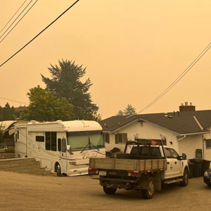 8月20日,在加拿大基洛纳,车辆在野火烟霾笼罩中的道路上行驶。