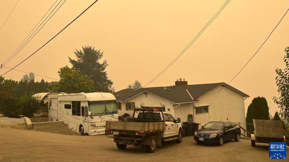 这是8月20日在加拿大基洛纳附近拍摄的野火烟霾笼罩中的房屋。
